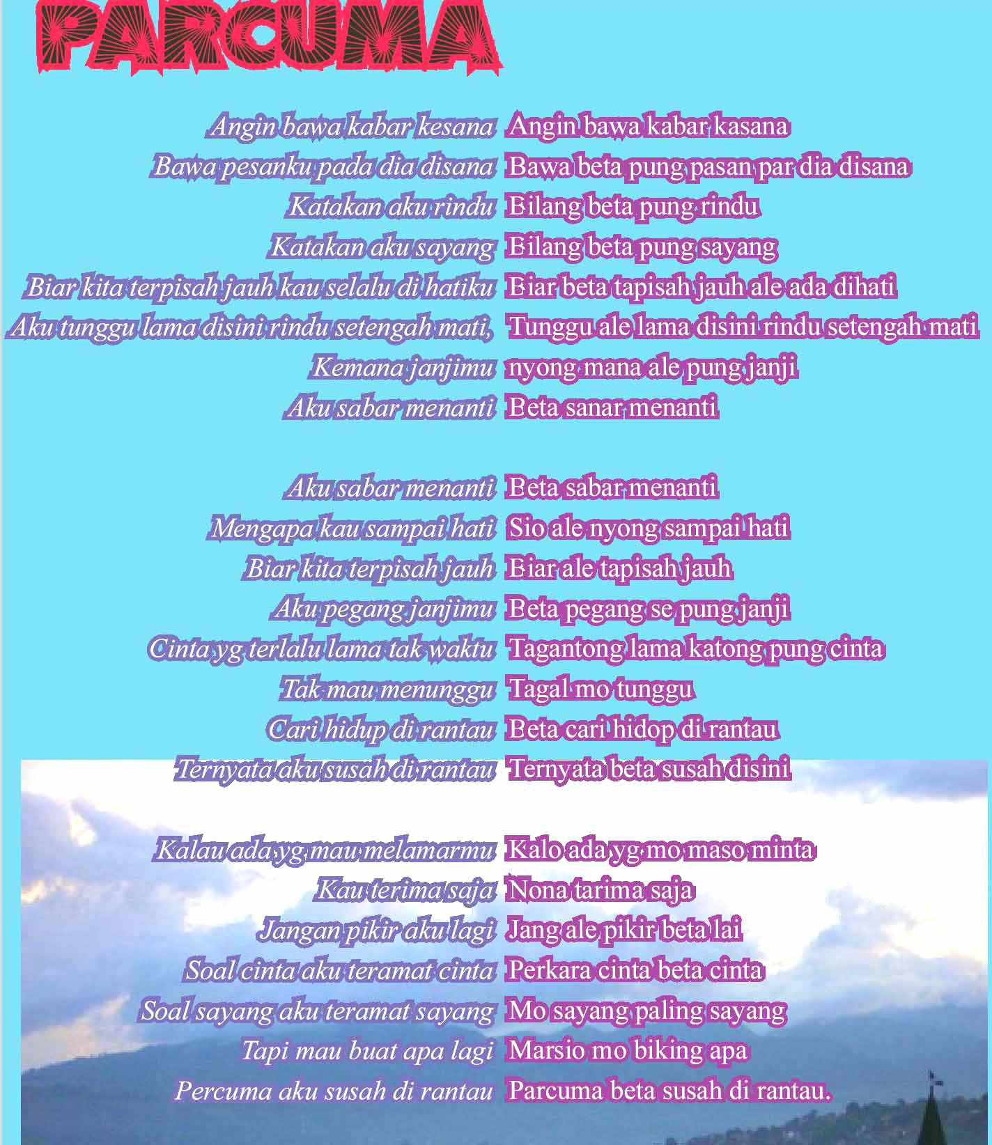 Lagu ambon orang ketiga lirik & video klip mp4. Lagu ambon terbaru 2018 vicky salamor orang ketiga | beta kasih cinta. Kunci gitar dan ukulele kami terkadang agak sulit dipahami karena masih . Lirik lagu parcuma beta bilang par ale kalo beta pung hati cuma par se parcuma samua beta korbankan kalo memang se masi deng yang laeng (cukup jua nona . C g f c f c g. Download lagu gratis, gudang lagu mp3 indonesia, lagu barat terbaik. Kal beta ini orang ketiga. Download lagu terbaru 2021 mudah, . Percuma beta bilang par alekalo bea pung hati cuma par sepercuma semua beta korbankankalo memang se . C g parcuma beta bilang par . C f g c g. Lagu orang ketiga ini dirilis pada tahun 2018 dan dipoduseri oleh pelita utama. F g biar beta seng sama deng dia.